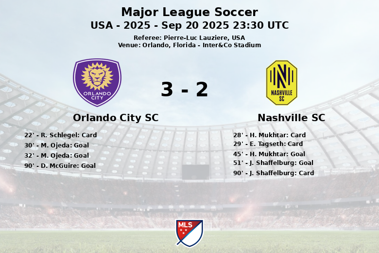 Orlando, Florida – En un emocionante encuentro disputado en el Inter&Co Stadium, Orlando City SC y Nashville SC igualaron en un partido lleno de alternativas. Orlando City, jugando en casa, abrió el marcador con dos goles consecutivos de M. Ojeda en los minutos 30 y 32, mostrando una gran efectividad en ataque. Sin embargo, Nashville SC reaccionó con fuerza. H. Mukhtar descontó antes del descanso en el minuto 45, seguido de un gol de J. Shaffelburg en el minuto 51, igualando así el marcador. El partido mantuvo un ritmo frenético hasta el final, con ambos equipos buscando la victoria. Cuando parecía que el empate era inminente, D. McGuire anotó para Orlando City en el minuto 90, con asistencia de T. Spicer. El encuentro finalizó con este resultado de 3-2. El partido se caracterizó por un alto número de faltas y tarjetas amarillas, reflejando la intensidad con la que ambos equipos disputaron cada balón. Orlando City terminó con un 37% de posesión, 13 tiros y una tarjeta amarilla, mientras que Nashville SC dominó la posesión con un 63%, realizó 8 tiros y recibió tres tarjetas amarillas. El árbitro Pierre-Luc Lauziere tuvo una noche ocupada en este partido de la jornada 31 de la temporada regular de la Major League Soccer.