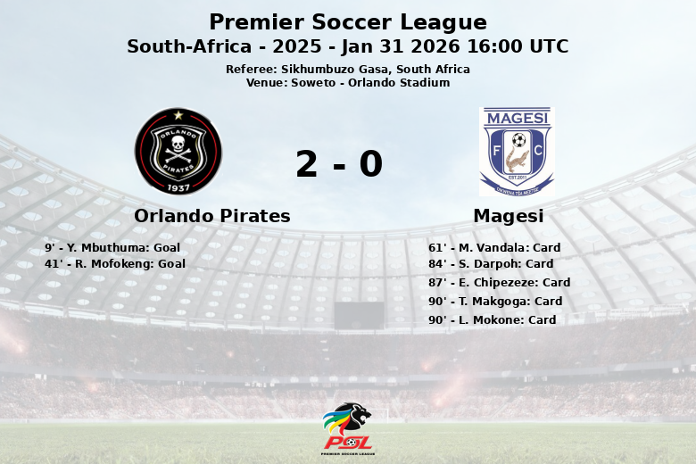 Soweto, Sudáfrica – En un encuentro disputado en el Orlando Stadium, el Orlando Pirates demostró su superioridad al vencer a Magesi con una clara demostración de dominio en el campo. El partido, correspondiente a la jornada 6 de la Premier Soccer League, vio a los Pirates controlar el juego con un 70% de posesión.