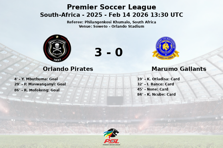 Soweto, Sudáfrica – El Orlando Pirates se impuso con autoridad al Marumo Gallants en el Orlando Stadium, en un encuentro vibrante de la Premier Soccer League. Desde el pitido inicial, los Pirates demostraron su superioridad, materializando su dominio en el marcador desde el minuto 4 con un gol de Y. Mbuthuma, asistido por R. Mofokeng.