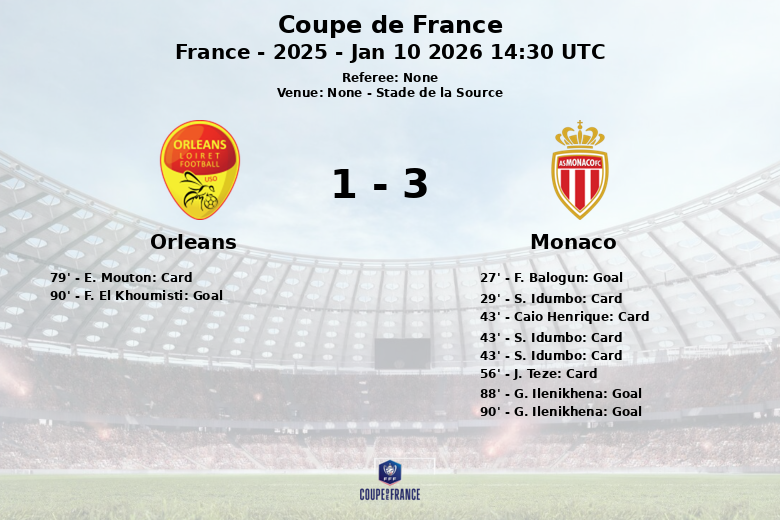 Stade de la Source, Francia – En un encuentro disputado el 10 de enero de 2026, el Mónaco logró una victoria en la Coupe de France ante el Orleans, en un partido marcado por la intensidad y la polémica. El Mónaco se adelantó en el marcador en el minuto 27 gracias a un gol de F. Balogun, con asistencia de D. Zakaria. El partido se tornó aún más complicado para el Mónaco tras la expulsión de S. Idumbo al minuto 43, producto de doble tarjeta amarilla.