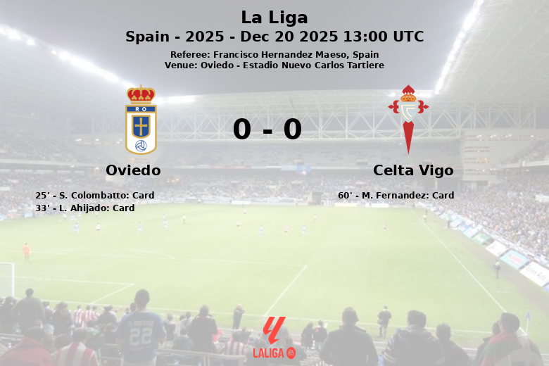 El partido se caracterizó por la intensidad, reflejada en las 13 faltas cometidas por el Oviedo y las 7 del Celta Vigo. El árbitro Francisco Hernandez Maeso mostró tarjetas amarillas a S. Colombatto y L. Ahijado del Oviedo, y a M. Fernandez del Celta Vigo. A pesar del dominio territorial del Oviedo y su mayor número de tiros, no logró concretar ninguna oportunidad, mientras que el Celta Vigo, aunque menos incisivo, se defendió con solidez para asegurar el punto. El encuentro, correspondiente a la temporada 2025, dejó un sabor agridulce en ambas aficiones.