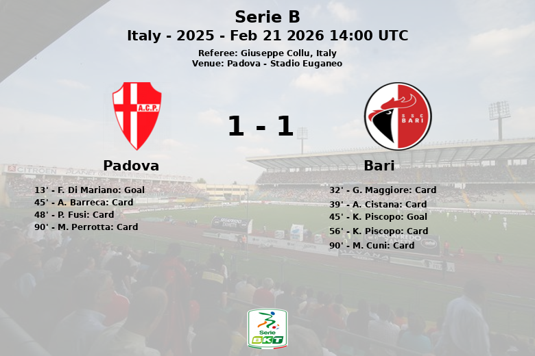 El encuentro se caracterizó por un alto número de faltas, 18 por parte de Padova y 15 por parte de Bari, y una lluvia de tarjetas amarillas. Padova recibió dos amonestaciones en la segunda mitad, elevando su total a tres, mientras que Bari sumó otras dos, finalizando con un total de cuatro. A pesar de los intentos de ambos equipos, el marcador no se movió más y el partido concluyó con un empate que deja un sabor agridulce para ambos conjuntos. Padova controló la posesión, pero Bari generó más peligro en el área rival.