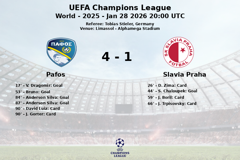El partido comenzó con un gol tempranero de V. Dragomir al minuto 17, poniendo en ventaja al Pafos. El Slavia Praga, con mayor posesión (55%), igualó las acciones al minuto 44 gracias a S. Chaloupek. Sin embargo, el segundo tiempo fue dominado por el Pafos. Bruno volvió a adelantar al equipo local al minuto 53. La expulsión de J. Boril al minuto 59 complicó aún más las cosas para el equipo checo. Ya en la recta final del partido, Anderson Silva brilló con un doblete (minutos 84 y 87), sellando la victoria para el Pafos. El Slavia Praga, a pesar de los esfuerzos, no pudo contrarrestar la ofensiva local y terminó el partido con un hombre menos y varias tarjetas amarillas. El partido concluyó con una victoria para el Pafos y un total de 7 saques de esquina y 11 faltas cometidas. El Slavia Praha cometió 16 faltas y solo logro obtener 1 saque de esquina.