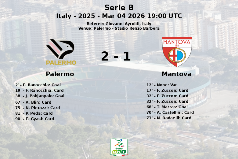 Palermo se adelantó temprano en el marcador gracias a un gol de F. Ranocchia en el minuto 2, asistido por T. Augello. La alegría local se extendió cuando J. Pohjanpalo amplió la ventaja en el minuto 38, tras una asistencia de A. Palumbo. Sin embargo, Mantova no se rindió y luchó por volver al partido.