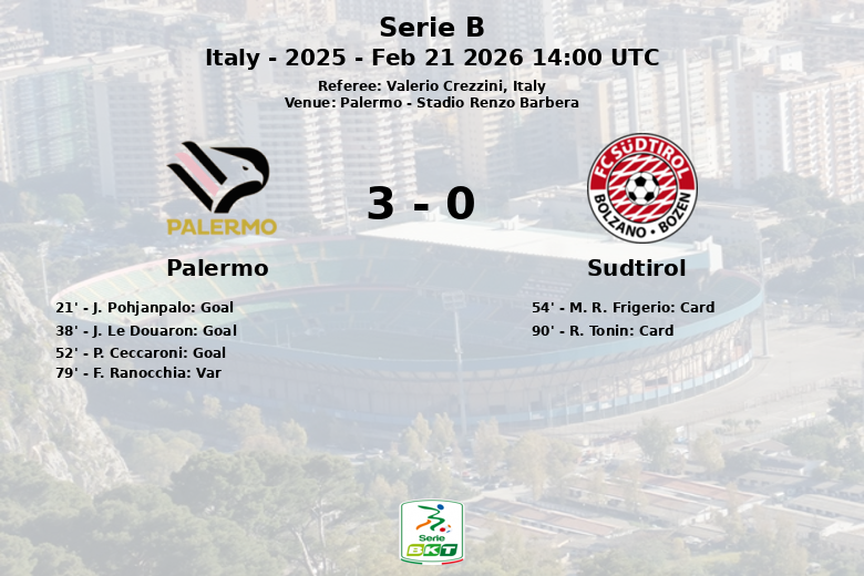El partido también tuvo momentos de tensión, con una tarjeta amarilla mostrada a M. R. Frigerio del Sudtirol al minuto 54 y otra a R. Tonin al minuto 90. A pesar de tener menos posesión del balón (41% contra el 59% del Sudtirol), el Palermo fue más efectivo en sus tiros a puerta (7 de 13, contra 3 de 14 del Sudtirol). El Palermo cometió 15 faltas y el Sudtirol 9.