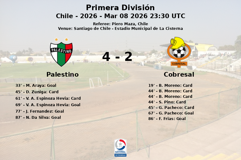 En un partido vibrante y lleno de alternativas disputado en el Estadio Municipal de La Cisterna, Palestino logró una importante victoria sobre Cobresal por marcador de 4 a 3. El encuentro, correspondiente a la sexta fecha de la Primera División chilena 2026, estuvo marcado por la intensidad y la alta efectividad de ambos equipos.