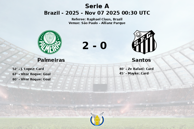 São Paulo, Brasil – En un encuentro disputado en el Allianz Parque, Palmeiras venció al Santos con un marcador de 2 a 0. El partido, correspondiente a la jornada 32 de la Serie A brasileña, estuvo marcado por la intensidad y el dominio del Palmeiras, que controló el 55% de la posesión del balón.