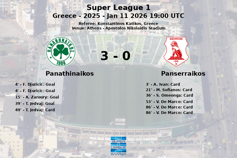 A pesar de un penal fallado tempranamente por F. Djuricic al minuto 4, el mismo jugador se redimió instantáneamente marcando el primer gol del partido en la misma jugada, pero sin asistencia. La presión del Panathinaikos continuó y A. Zaroury amplió la ventaja con un gol de penalti al minuto 15. T. Jedvaj sentenció prácticamente el partido al minuto 39 con un gol tras asistencia de A. Zaroury, estableciendo un marcador difícil de remontar para el Panserraikos.