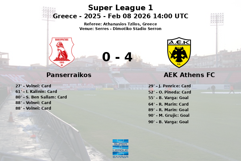 Serres, Grecia – El AEK Atenas se impuso al Panserraikos en el Dimotiko Stadio Serron en un partido correspondiente a la jornada 20 de la Super League 1. A pesar de jugar en casa, el Panserraikos se vio superado por un AEK Atenas que controló el encuentro con un 80% de posesión del balón, frente a un 20% de los locales.