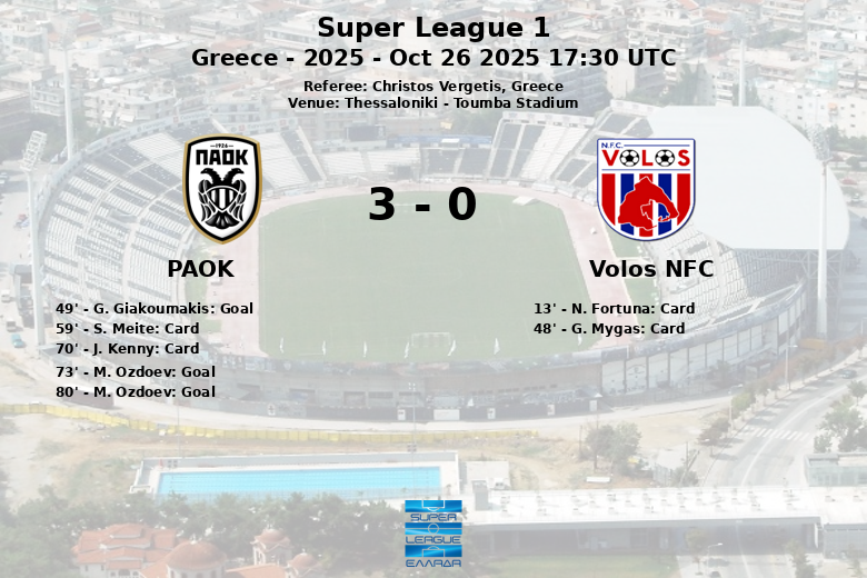 En la segunda mitad, el PAOK continuó presionando y ampliando su ventaja con dos goles de M. Ozdoev, en los minutos 73 y 80, sellando una contundente victoria. El Volos NFC, aunque intentó reaccionar, no logró revertir la situación y apenas inquietó a la defensa local. El partido finalizó con una victoria cómoda para el PAOK, reflejo de su superioridad en el campo de juego. El encuentro estuvo marcado por un total de cuatro tarjetas amarillas, dos por cada equipo, y 22 faltas cometidas.