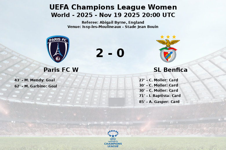 En la segunda mitad, el dominio del Paris FC se hizo aún más evidente. M. Garbino amplió la ventaja en el minuto 62, nuevamente con asistencia de A. Le Moguedec. El Benfica, a pesar de los esfuerzos, no logró contrarrestar el ataque del equipo local. El encuentro concluyó con el Paris FC habiendo realizado 13 tiros, 8 de ellos a puerta, mientras que el Benfica solo pudo registrar 10 tiros, con apenas 2 dirigidos al arco. El partido también estuvo marcado por tarjetas amarillas para I. Baptista y A. Gasper del Benfica. El Paris FC terminó el partido sin recibir ninguna amonestación. El resultado final reflejó la superioridad del equipo francés en esta jornada de la Liga de Campeones Femenina.