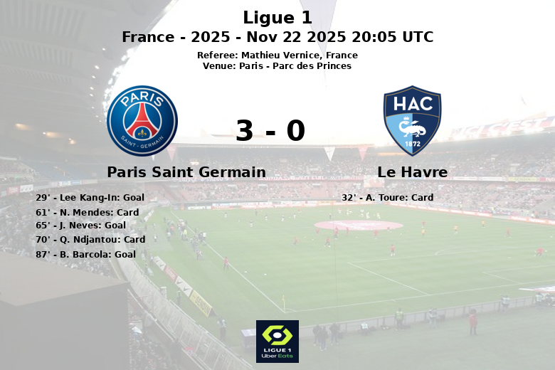 El primer gol del partido llegó en el minuto 29, gracias a un remate de Lee Kang-In, asistido por N. Mendes. El Le Havre, que mostró dificultades para contener el ataque parisino, sufrió una tarjeta amarilla para A. Toure en el minuto 32.