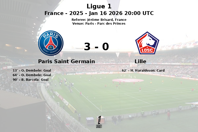 París, Francia – El Paris Saint-Germain se impuso con autoridad al Lille en el Parc des Princes en un partido correspondiente a la Ligue 1. El PSG, con una posesión del 61%, controló el ritmo del encuentro desde el inicio. Ousmane Dembélé fue la figura del partido, marcando dos goles, el primero en el minuto 13 con asistencia de Vitinha y el segundo en el minuto 64 asistido por D. Doue. El dominio del PSG se consolidó en el tiempo añadido con un gol de B. Barcola, sin asistencia.