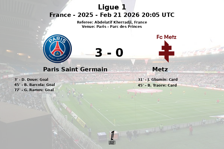 El primer gol llegó temprano, al minuto 3, gracias a un tanto de D. Doue asistido por W. Zaire-Emery, dando una clara señal de las intenciones del equipo parisino. El Metz, aunque luchó, se vio superado y acumuló tarjetas amarillas para J. Gbamin (minuto 31) y B. Traore (minuto 45).