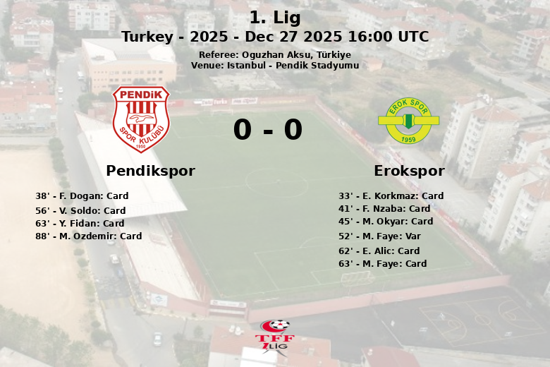 El partido estuvo marcado por la intensidad en el mediocampo, reflejado en la cantidad de amonestaciones: cuatro tarjetas amarillas para Pendikspor y cinco para Erokspor. A pesar de registrar doce tiros totales, Pendikspor solo logró dirigir tres de ellos a puerta, mientras que Erokspor no consiguió inquietar al guardameta local con ninguno de sus cuatro intentos.