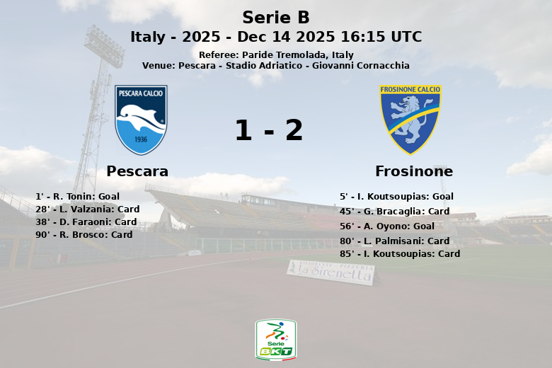 En un partido disputado en el Stadio Adriatico – Giovanni Cornacchia de Pescara, Frosinone logró imponerse al equipo local en un encuentro marcado por la intensidad y las tarjetas. El partido comenzó con un gol tempranero de R. Tonin para Pescara al minuto 1, con asistencia de M. Dagasso, presagiando un duelo favorable para el equipo de casa. Sin embargo, la alegría duró poco, ya que I. Koutsoupias igualó el marcador para Frosinone apenas cuatro minutos después, asistido por I. Monterisi.