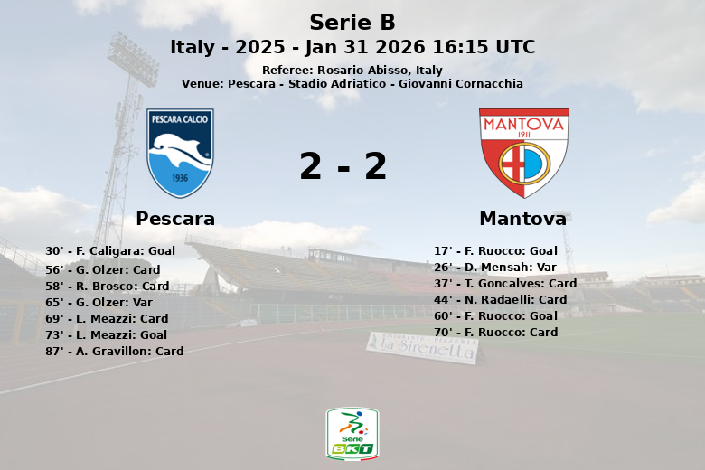 En la segunda mitad, Mantova volvió a tomar la delantera con otro gol de F. Ruocco en el minuto 60, esta vez con asistencia de D. Mensah. No obstante, el Pescara no se rindió y logró empatar el partido nuevamente en el minuto 73 gracias a L. Meazzi, con asistencia de A. Gravillon. Antes de este gol, el VAR había anulado un gol de G. Olzer para el Pescara por mano.