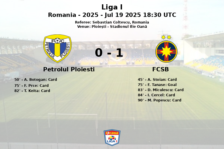 Ploieşti, Rumania – En un encuentro disputado en el Stadionul Ilie Oană, el FCSB se llevó una valiosa victoria ante el Petrolul Ploieşti con un gol solitario en el minuto 75 de F. Tanase, asistido por I. Cercel. El partido, correspondiente a la jornada 2 de la Liga I rumana, fue un duelo táctico con ambos equipos mostrando un juego equilibrado.