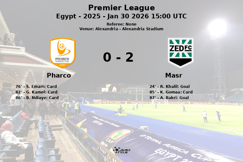 La situación se complicó para Pharco en el minuto 82 cuando G. Kamel recibió una tarjeta roja, dejando a su equipo con diez jugadores. Masr aprovechó la superioridad numérica y, en el minuto 87, A. Bakri sentenció el partido con un gol asistido por S. Ibrahim.