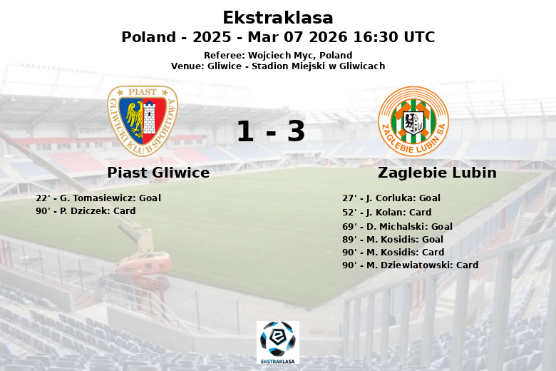 La segunda mitad vio al Zaglebie Lubin tomar la delantera con un gol de D. Michalski al minuto 69. Ya en los últimos compases del encuentro, M. Kosidis sentenció el partido al minuto 89, sellando la victoria para el equipo visitante. El partido fue dirigido por el árbitro Wojciech Myc.