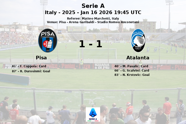 El primer gol del partido llegó en el minuto 83, cuando N. Krstovic anotó para Atalanta, poniendo a su equipo por delante. Sin embargo, la alegría duró poco, ya que en el minuto 87 R. Durosinmi igualó el marcador para Pisa con asistencia de M. Leris, desatando la euforia en la afición local.