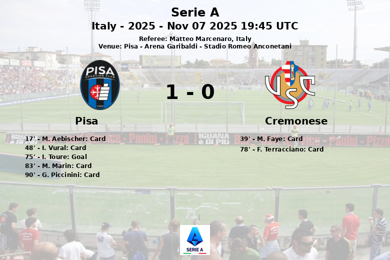 El primer tiempo transcurrió sin goles, pero con varias amonestaciones, M. Aebischer de Pisa recibió una tarjeta amarilla al minuto 17, y M. Faye de Cremonese al minuto 39. En el segundo tiempo, la contienda continuó siendo física, con I. Vural de Pisa recibiendo una tarjeta amarilla al minuto 48. El momento decisivo llegó al minuto 75, cuando I. Toure anotó para Pisa con asistencia de M. Tramoni, desatando la euforia en la afición local. Hacia el final del partido, M. Marin y G. Piccinini de Pisa, y F. Terracciano de Cremonese también fueron amonestados. Ambos equipos realizaron ajustes tácticos, pero el gol de Toure fue suficiente para asegurar la victoria de Pisa. En cuanto a los tiros, ambos equipos realizaron 13, pero Pisa logró acertar 6 a puerta, frente a solo 3 de Cremonese.