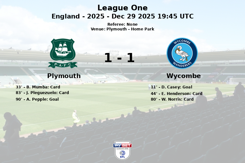 Plymouth, Inglaterra – En un encuentro disputado en el Home Park, Plymouth y Wycombe igualaron en un partido que mantuvo a los aficionados al borde de sus asientos. El Wycombe Wanderers se adelantó en el minuto 11 gracias a un gol de D. Casey, asistido por J. Grimmer, prometiendo un dominio inicial del equipo visitante.