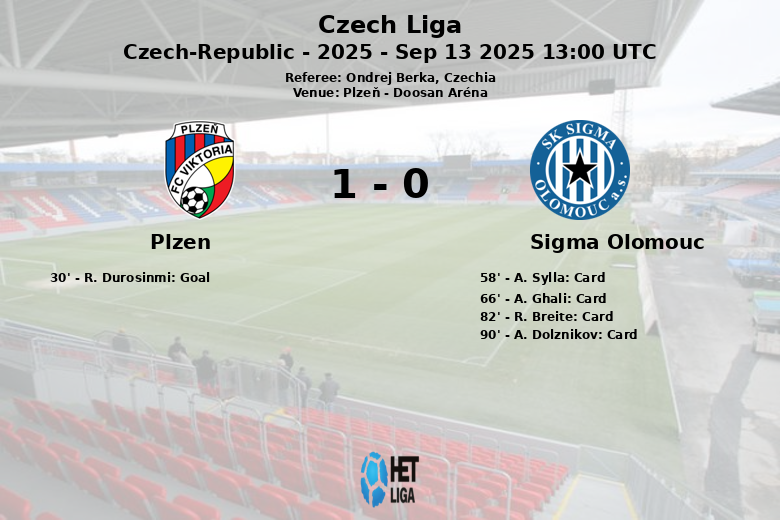 Plzeň, República Checa – En un encuentro disputado en el Doosan Aréna, el Plzen logró una victoria frente al Sigma Olomouc en la octava jornada de la Liga Checa. El único gol del partido llegó a los 30 minutos, obra de R. Durosinmi, con una asistencia de C. Souare, dando la ventaja definitiva al equipo local.