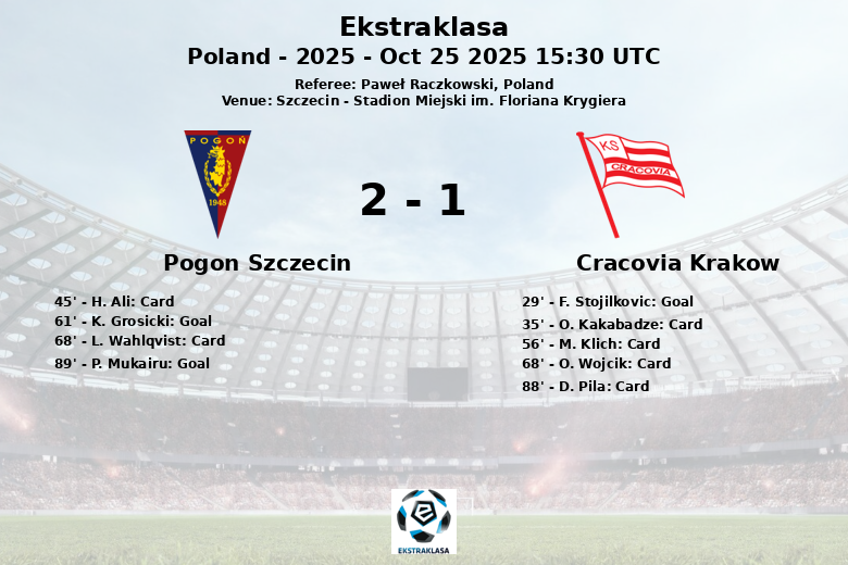 El Cracovia Krakow se adelantó en el minuto 29 gracias a un gol de F. Stojilkovic. Sin embargo, el Pogon Szczecin dominó la posesión del balón con un 57% y no se rindió. K. Grosicki empató el partido en el minuto 61, y P. Mukairu selló la victoria para el equipo local en el minuto 89, con una asistencia de F. Ulvestad.