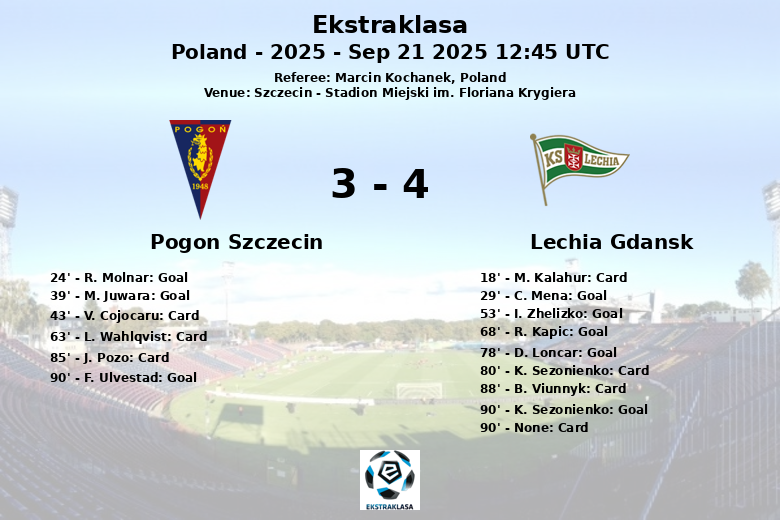 Cuando parecía que la victoria se iba para Gdansk, K. Sezonienko anotó al minuto 90 para poner el 5 a 4, pero F. Ulvestad transformó un penalti en el último minuto del tiempo reglamentario para sellar el empate final. Un partido para el recuerdo, con 22 tiros del Pogon (9 a puerta) y 12 del Lechia (9 a puerta), pero con un reparto de puntos que deja a ambos equipos con sensaciones agridulces. El árbitro Marcin Kochanek mostró un total de 6 tarjetas amarillas, 3 para cada equipo.