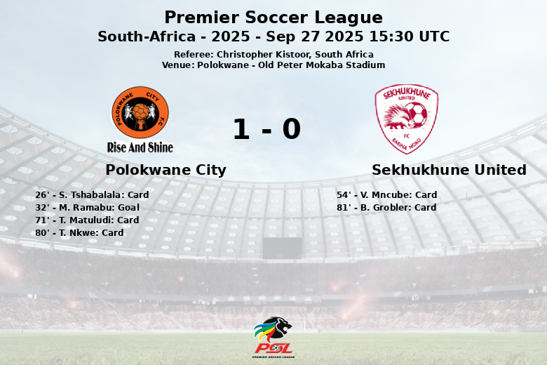 La segunda mitad continuó con la misma tónica, con Sekhukhune United buscando el empate sin éxito. El árbitro Christopher Kistoor mostró varias tarjetas amarillas: V. Mncube (Sekhukhune United) al 54′, T. Matuludi (Polokwane City) al 71′, T. Nkwe (Polokwane City) al 80′ y B. Grobler (Sekhukhune United) al 81′. Finalmente, Polokwane City defendió su ventaja y se alzó con una valiosa victoria. El partido se jugó en Polokwane en el Old Peter Mokaba Stadium.