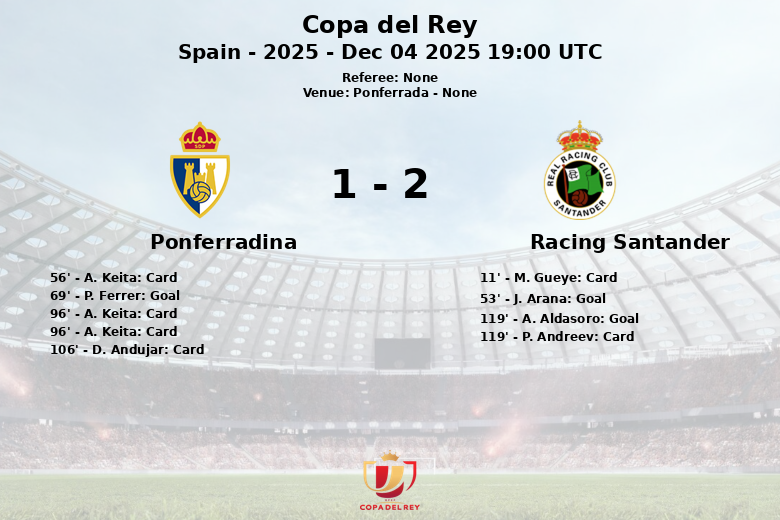 En la prórroga, el Racing Santander logró desequilibrar la balanza con un gol de A. Aldasoro en el minuto 119, sellando así su pase a la siguiente ronda. El encuentro no estuvo exento de incidentes, con un total de 3 tarjetas amarillas para la Ponferradina y 2 para el Racing Santander. A. Keita de la Ponferradina fue expulsado por doble amarilla en el minuto 96.