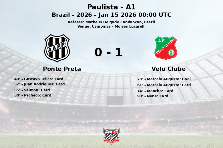 En un partido disputado en el estadio Moisés Lucarelli de Campinas, Velo Clube se llevó la victoria ante Ponte Preta en la segunda ronda de la temporada regular del Paulista A1. El único gol del encuentro llegó al minuto 28, cuando Marcelo Augusto, asistido por Luiz Otavio, perforó la red defendida por el equipo local.