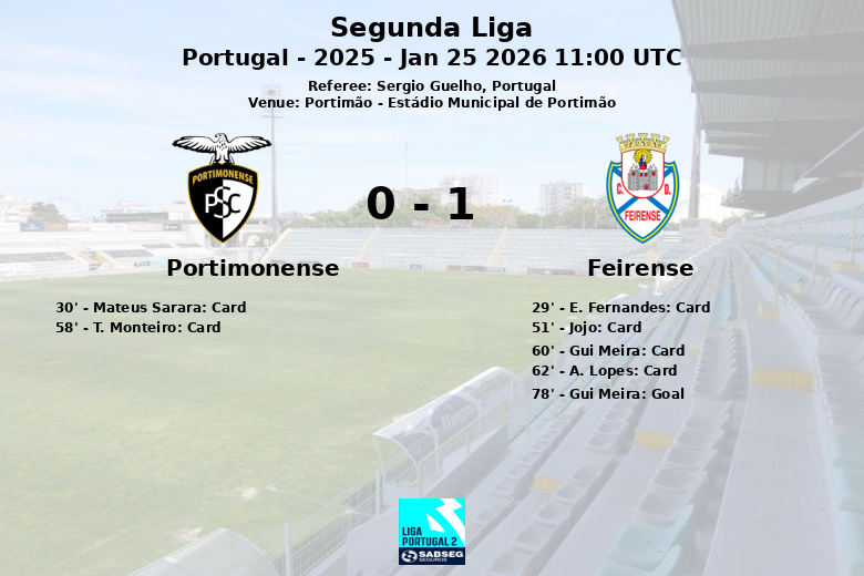 Portimão, Portugal – En un encuentro de la Segunda Liga disputado en el Estádio Municipal de Portimão bajo el arbitraje de Sergio Guelho, el Feirense logró imponerse al Portimonense en un partido marcado por la intensidad y la lucha en el mediocampo. A pesar de que las estadísticas de posesión, tiros, corners y faltas no fueron proporcionadas, el partido se caracterizó por un juego físico, reflejado en las seis tarjetas amarillas mostradas a lo largo del encuentro, dos para el Portimonense (Mateus Sarara y T. Monteiro) y cuatro para el Feirense (E. Fernandes, Jojo, Gui Meira y A. Lopes).