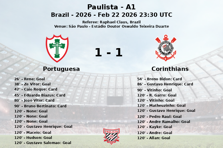 Portuguesa tomó la delantera con un gol de Rene al minuto 26, tras aprovechar una asistencia del mismo Rene después de fallar un penal. Ze Vitor amplió la ventaja para Portuguesa al minuto 38 con un gol. La intensidad del encuentro se vio reflejada en las tarjetas amarillas mostradas a Caio Roque y Eduardo Biazus por Portuguesa en los minutos 42 y 45 respectivamente, y a Breno Bidon por Corinthians al minuto 54 y a Gustavo Henrique al minuto 86. La tensión fue palpable durante todo el encuentro. Joao Vitor de Portuguesa al minuto 80 y Bruno Bertinato al minuto 90 también fueron sancionados con tarjeta amarilla.