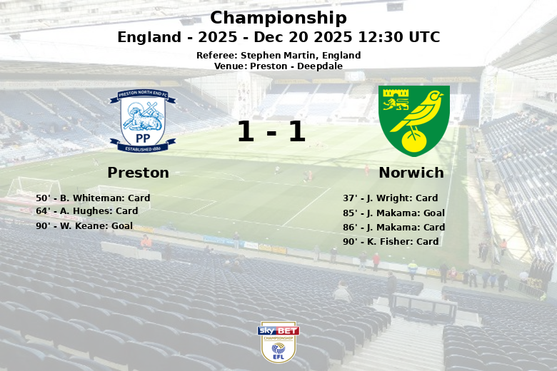 El Norwich, con una ligera ventaja en la posesión del balón (53%), logró abrir el marcador en el minuto 85 gracias a un gol de J. Makama, asistido por E. Marcondes. Sin embargo, la alegría de los visitantes fue efímera, ya que, en el minuto 90, W. Keane igualó el marcador para el Preston, dejando el resultado final en empate.