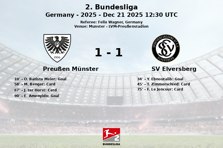 La segunda parte continuó con la misma intensidad, marcada por varias amonestaciones: M. Benger y J. ter Horst por el Preußen Münster, y F. Le Joncour por el SV Elversberg. El partido parecía destinado al empate, pero en el último minuto del tiempo reglamentario, E. Amenyido del Preußen Münster, con asistencia de P. Jaeckel, logró el gol que selló el empate final.