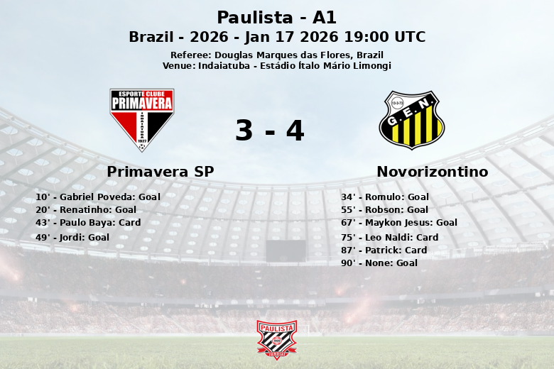 La segunda mitad comenzó de manera inusual con un autogol de Jordi que le daba esperanza al Novorizontino. El equipo visitante, con mayor posesión del balón (54% frente al 46% del Primavera SP), continuó presionando y encontró el empate a través de Robson al minuto 55, asistido por Maykon Jesus. Novorizontino se adelantó en el marcador gracias a un gol de Maykon Jesus al minuto 67, con asistencia de Rómulo. Pero el drama no había terminado, ya que en los últimos minutos del partido, Novorizontino encontró la red para sellar el empate definitivo. A pesar de los 11 tiros del Primavera SP (4 a puerta y 4 fuera) y sus 8 saques de esquina, el Novorizontino, con 13 tiros (5 a puerta y 7 fuera) y 5 saques de esquina, logró llevarse un punto valioso de Indaiatuba. El árbitro Douglas Marques das Flores amonestó a tres jugadores durante el encuentro: Paulo Baya por el Primavera SP, y Leo Naldi y Patrick por el Novorizontino.