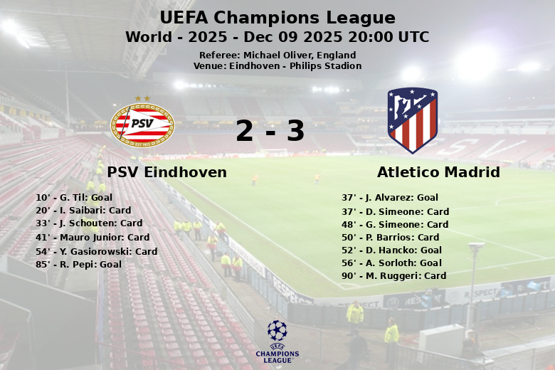 Eindhoven, Países Bajos – En un partido lleno de acción disputado en el Philips Stadion, el PSV Eindhoven y el Atlético de Madrid empataron en un vibrante encuentro correspondiente a la fase de grupos de la UEFA Champions League. El partido, dirigido por el árbitro inglés Michael Oliver, estuvo cargado de intensidad desde el pitido inicial.