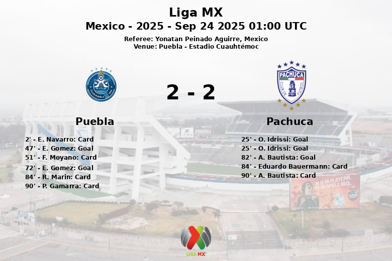 El Pachuca se adelantó en el marcador al minuto 25 gracias a una anotación de O. Idrissi, quien momentos antes había fallado un penal. Sin embargo, el Puebla no se amilanó y respondió rápidamente al inicio del segundo tiempo. E. Gomez, con asistencia de F. Moyano, igualó el marcador al minuto 47. Gomez volvió a aparecer al minuto 72, esta vez con asistencia de C. Baltazar, para darle la ventaja al Puebla. Cuando parecía que los locales se llevarían la victoria, A. Bautista del Pachuca anotó al minuto 82, asistido por J. Cadiz, sellando el empate definitivo.