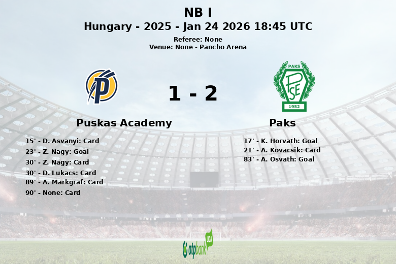El encuentro estuvo marcado por un alto número de faltas y tarjetas amarillas. El Puskas Academy acumuló 18 faltas y 5 tarjetas amarillas, mientras que el Paks cometió 15 faltas y recibió una tarjeta amarilla. El Paks abrió el marcador temprano en el minuto 17 con un penal convertido por K. Horvath. El Puskas Academy respondió al minuto 23 con otro penal, esta vez anotado por Z. Nagy, igualando el marcador. A pesar del dominio del Paks en el juego y los tiros a puerta, el Puskas Academy se mantuvo firme en defensa. El Paks logró empatar el partido nuevamente en el minuto 83 con un gol de A. Osvath, sellando el empate final. El partido terminó con un tenso empate a dos goles.