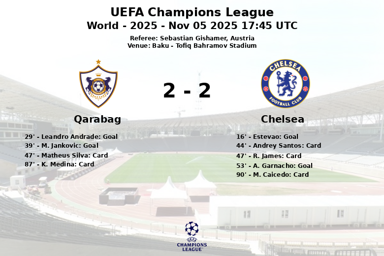 Bakú fue testigo de un emocionante empate entre el Qarabag y el Chelsea en un partido correspondiente a la UEFA Champions League, celebrado en el Tofiq Bahramov Stadium. El encuentro, arbitrado por el austriaco Sebastian Gishamer, finalizó con un marcador que reflejó la intensidad y el esfuerzo de ambos equipos.