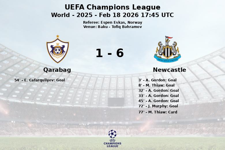 Baku, 18 de febrero de 2026 – El Newcastle United desató una tormenta ofensiva en el estadio Tofiq Bəhramov, aplastando al Qarabag con un contundente marcador. El encuentro, correspondiente a la ronda de 32 de la UEFA Champions League, se convirtió en una exhibición de poderío por parte del conjunto inglés, que dominó el partido desde el pitido inicial.