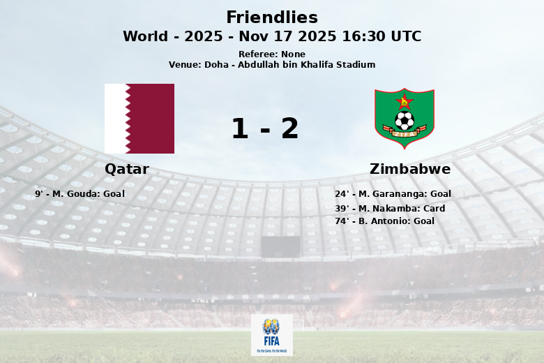 En la segunda mitad, Zimbabwe continuó luchando y logró tomar la delantera al minuto 74 con un gol de B. Antonio, asistido por P. Padera. A pesar de los esfuerzos de Qatar por igualar el marcador, la defensa zimbabuense se mantuvo firme.