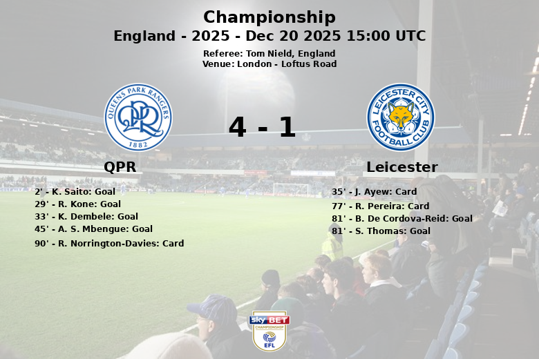 Londres, Inglaterra – En un partido disputado en el Loftus Road, el QPR demostró una contundente superioridad al vencer al Leicester con una exhibición ofensiva. Desde el pitido inicial, el equipo local impuso su ritmo, abriendo el marcador en el minuto 2 con un gol de K. Saito, asistido por R. Burrell. La presión del QPR continuó, y R. Kone amplió la ventaja en el minuto 29. Antes del descanso, K. Dembele anotó el tercer gol en el minuto 33, nuevamente con asistencia de R. Burrell, seguido por un tanto de A. S. Mbengue en el minuto 45, asistido por J. Dunne, sellando una primera mitad arrolladora.
