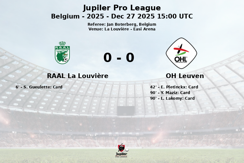 El partido estuvo marcado por la intensidad y las faltas, con el RAAL La Louvière cometiendo 7 faltas y recibiendo una tarjeta amarilla (S. Gueulette al minuto 6). El OH Leuven acumuló 13 faltas y recibió tres tarjetas amarillas (E. Pletinckx al minuto 42, Y. Maziz y L. Lakomy ambos al minuto 90). El árbitro, Jan Boterberg, tuvo que lidiar con la creciente tensión en el campo a medida que avanzaba el encuentro. Ninguno de los equipos sufrió expulsiones. Al final, el marcador no se movió y ambos equipos sumaron un punto en la tabla de posiciones.