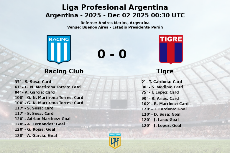 Buenos Aires, Argentina – En un encuentro cargado de tensión y emociones disputado en el Estadio Presidente Perón, Racing Club logró superar a Tigre en una intensa tanda de penales tras un empate sin goles en el tiempo reglamentario y la prórroga. El árbitro Andrés Merlos tuvo una noche ocupada mostrando un total de 9 tarjetas amarillas y 3 rojas, reflejo de la alta intensidad y el juego físico desplegado por ambos equipos.