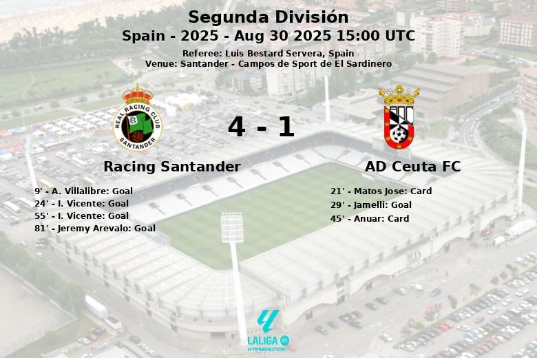El Racing Santander se impuso con autoridad al AD Ceuta FC en un encuentro disputado en el Campos de Sport de El Sardinero. Desde el inicio, el dominio del Racing fue evidente, reflejado en una posesión del balón del 64%. A los 9 minutos, A. Villalibre abrió el marcador con un gol, asistido por I. Vicente. El propio I. Vicente amplió la ventaja racinguista en el minuto 24, con un tanto producto de una asistencia de P. Canales. El AD Ceuta FC intentó reaccionar y Jamelli descontó desde el punto de penalti en el minuto 29. Sin embargo, la expulsión de Anuar justo antes del descanso complicó aún más las cosas para el equipo visitante. En la segunda mitad, el Racing continuó controlando el juego e I. Vicente, en gran forma, anotó su segundo gol del partido al minuto 55 con asistencia de Villalibre. Jeremy Arevalo cerró la goleada racinguista en el minuto 81. El AD Ceuta FC, con diez jugadores, apenas pudo inquietar la portería rival y solo consiguió un tiro a puerta en todo el partido. El Racing Santander mostró una superioridad notable, concretando 9 de sus 15 disparos a portería y dominando en el juego aéreo, mientras que la disciplina del Ceuta se vio comprometida. El colegiado Luis Bestard Servera dirigió el encuentro.