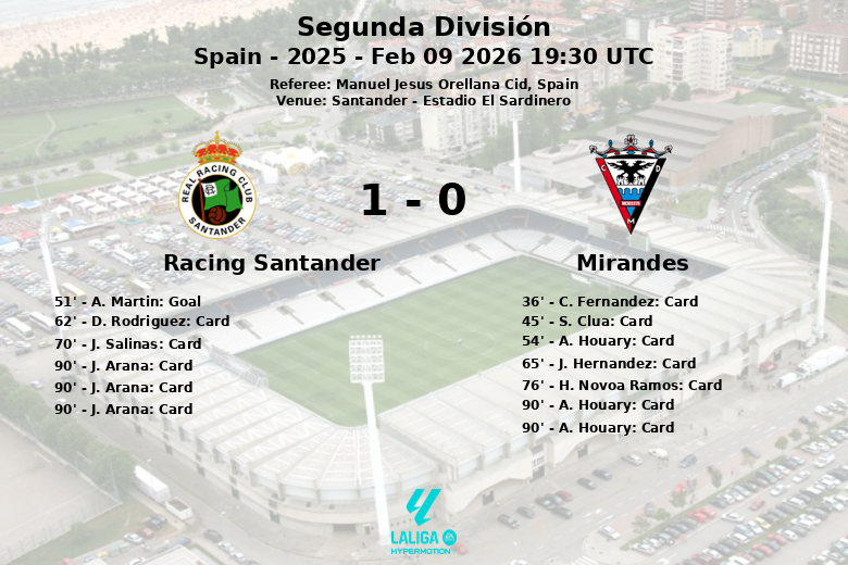 El Racing Santander se llevó la victoria en casa ante el Mirandés en un partido disputado en el Estadio El Sardinero, correspondiente a la jornada 25 de la Segunda División. El encuentro, arbitrado por Manuel Jesús Orellana Cid, estuvo marcado por la intensidad y la disciplina, reflejada en la gran cantidad de tarjetas mostradas.