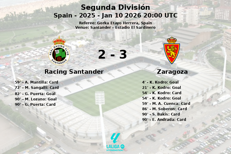 Santander, España – En un encuentro electrizante disputado en el Estadio El Sardinero, el Zaragoza se impuso al Racing con un marcador de 3 a 2, en un partido que mantuvo a los aficionados al borde de sus asientos hasta el último segundo. El delantero K. Kodro fue la figura destacada del encuentro, firmando un impresionante hat-trick que catapultó al Zaragoza a la victoria.